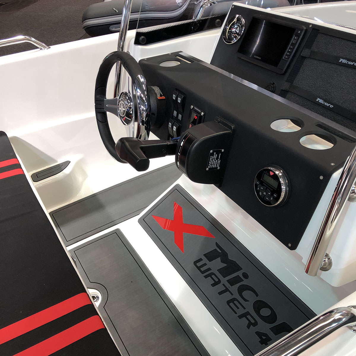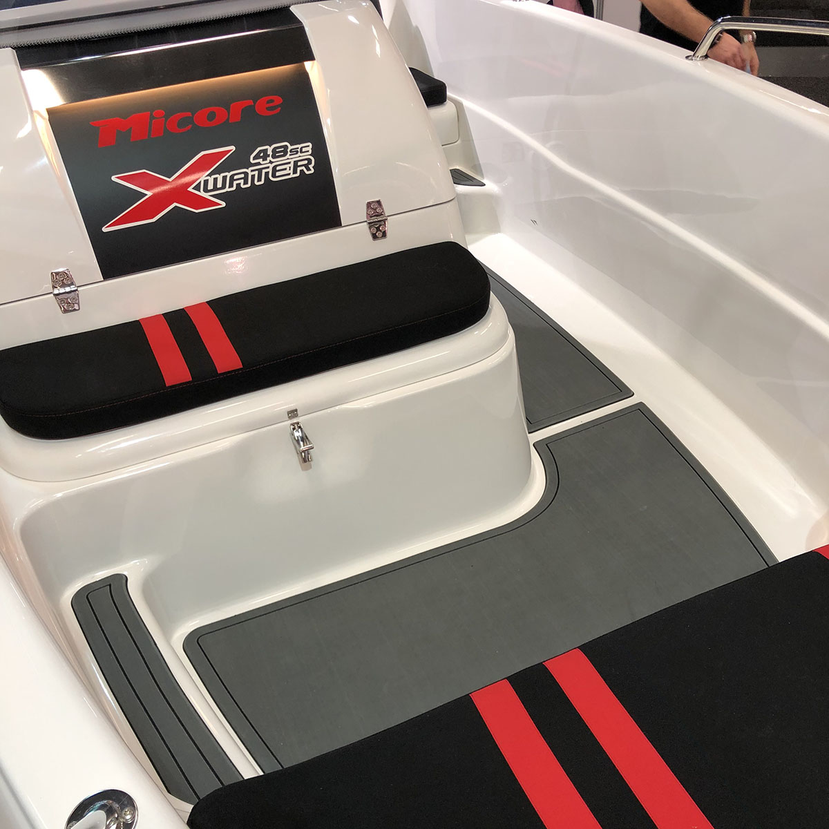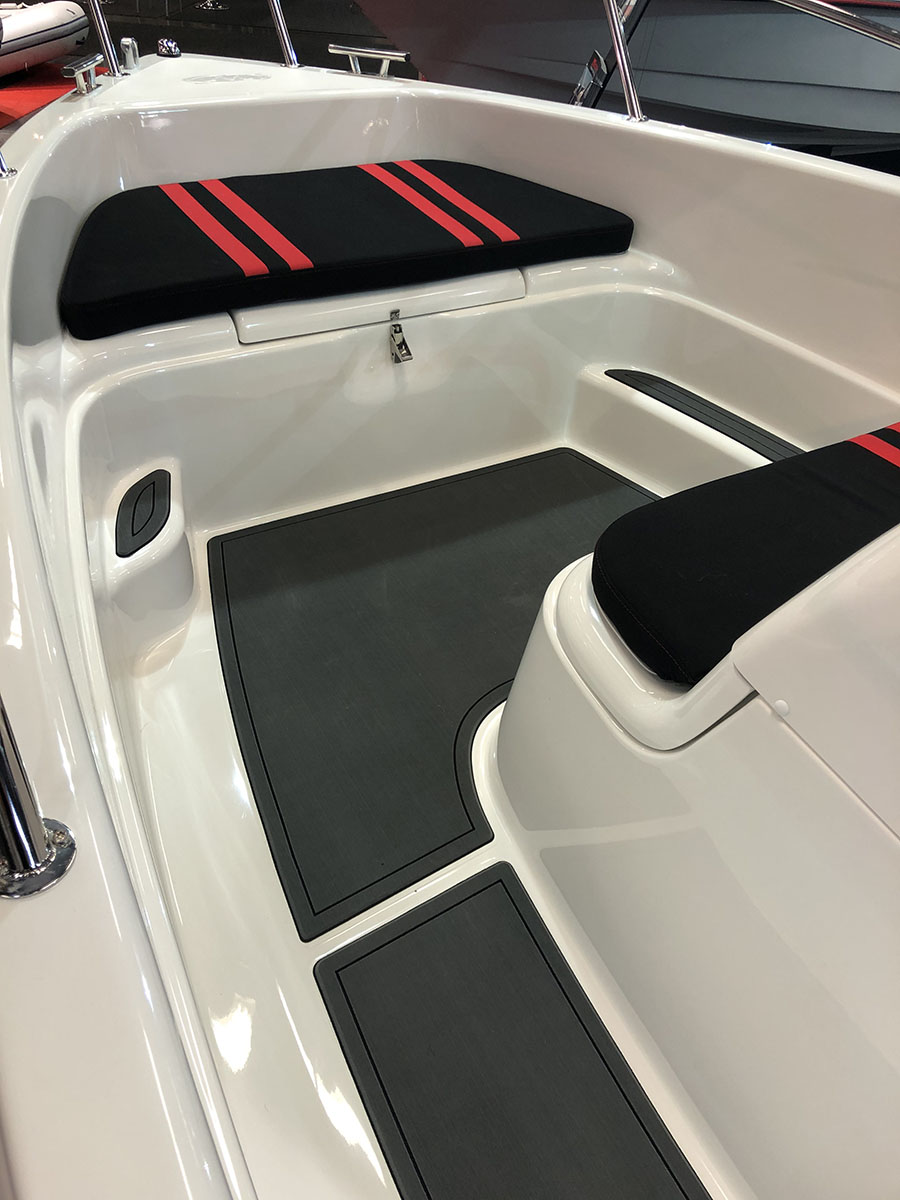 Halkfri samt UV beständig durkmatta i grå EVA-material som ger båten ett mycket behagligt däck att gå på.